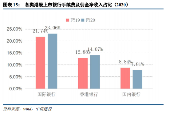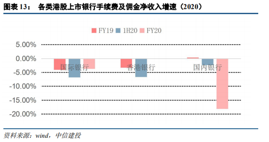 从2020年港股上市的银行手续费及佣金净收入同比增速来看,所有类型银行的手续费及佣金收入均为负增长,其中香港银行降幅最小,仅微降0.01%。国内银行的手续费及佣金净收入整体降幅最大,同比下降18.15%;而国际银行整体同比下降3.72%。
