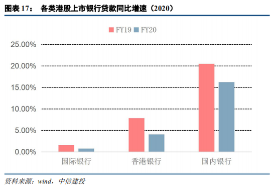 从2020年利息净收入增速来看,各类银行利息净收入同比均为负增长,净息差下滑及贷款增速减慢是主因。其中香港银行降幅最大,利息净收入同比下降15.31%;其次为国际银行,利息净收入同比下降10.11%;而国内银行的降幅最小,利息净收入同比下降1.27%。