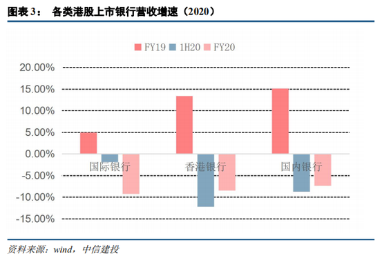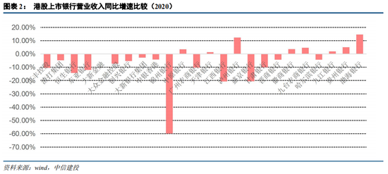 从2020年港股上市的24家银行(剔除A+H上市)的营业收入增长来看,所有国际银行和香港银行营收均为负增长,国内银行则表现差异化。其中国际银行营收增速整体下降9.27%,香港银行下降8.46%,受全球疫情蔓延以及低息环境影响,国际银行及香港银行的经济环境受影响较大。国内银行则下降7.40%,降幅最小,如果剔除降幅最大的锦州银行,国内银行营收增速同比下降仅1.49%。