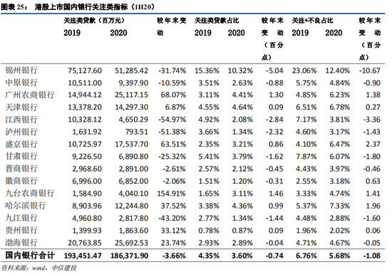 具体来看,关注类贷款改善最明显的是锦州银行,关注类贷款余额大幅下降了31.74%,关注类贷款、关注+不良占比分别下降了5.04、10.67个百分点,资产质量改善明显,但是关注类占比依然是同类银行最高的,达10.31%。其次关注类贷款改善较达的为江西银行,关注类占比为2.08%,同比下降2.84个百分点,关注+不良占比为3.81%,同比下降3.36个百分点。关注类贷款占比最低的为贵州银行,占比仅0.87%,同比微升9bps,关注+不良占比为2.02%,同比提升6bps。