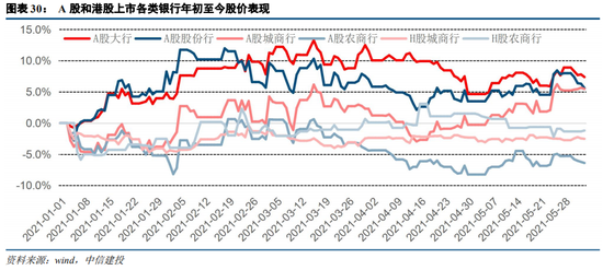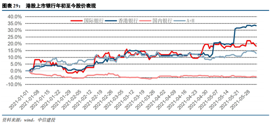 股价表现:停止派息或大幅减息的疑虑消除,国际银行及香港银行的股价今年以来不断修复。截至2021-06-03,国际银行平均股价整体较年初上涨了18.2%,而香港银行上涨了33.3%。香仅在港股上市的国内银行股价表现疲弱,年初至今股价累计下跌4.4%。