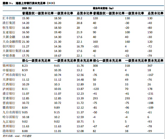 2020年港股上市的內银资本充足率同样表现分化。其中锦州银行、中原银行、江西银行、甘肃银行三大资本充足率均提高,其中锦州银行2020年9元完成120.9亿元定向增发,三大资本充足率大幅提升,分别提高308bps、318bps、367bps。而广州农商行、盛京银行、晋商银行、徽商银行、九台农商行、贵州银行三大资本充足率均在下滑。整体来看,大部分港股上市的内地上市银行的核心一级资本充足率补充压力较大,接近监管红线。