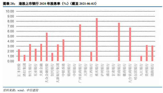 受疫情及全球经济不明朗影响,汇丰控股及渣打集团两家国际银行在2020年内未进行派息,但是今年恢复派息,汇丰控股决定2020年度派息0.15美元/股,渣打集团0.09美元/股,分红比例分别达59.4%及39.4%,同比变动为-24.3个百分点和29.4个百分点,整体分红比例高于国内银行。所有香港银行分红比例均有下降,整体香港银行分红比例为37.2%,较上年下降3.8个百分点。而仅在港股上市的国内银行分红比例表现差异化,部分银行选择年度不派息,包括中原、天津、泸州、徽商及哈尔滨银行,而2019年有派息。其他有派息的国内银行平均分红率为30.0%,与A股上市银行相当。