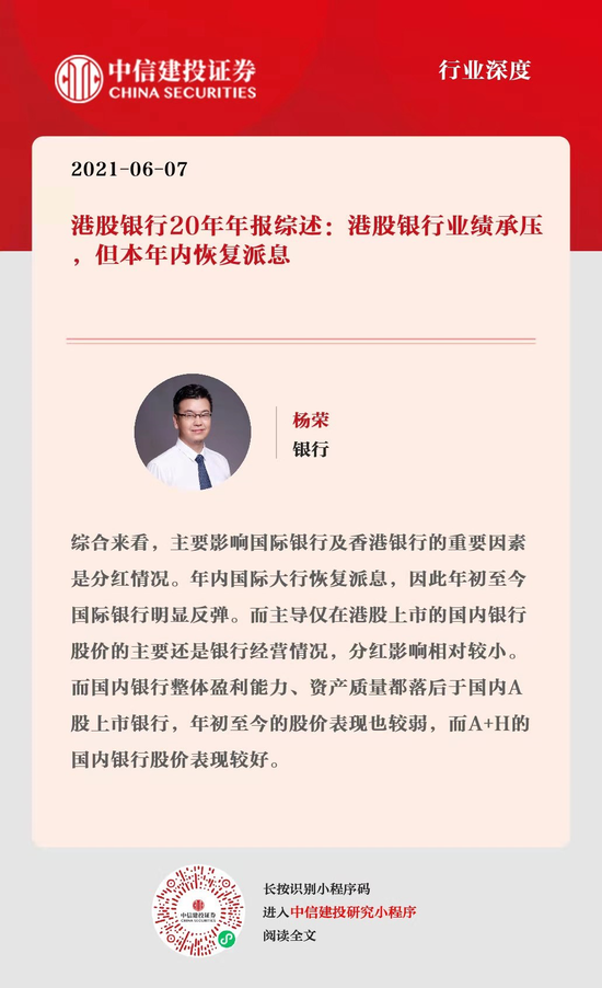 本报告中报综述的港股银行主要包括国际银行,香港银行以及仅在港股上市的国内银行。而A+H的上市银行的年报综述已经在银行业20年年报综述《轻装上阵,基本面确定性向上》中讨论。