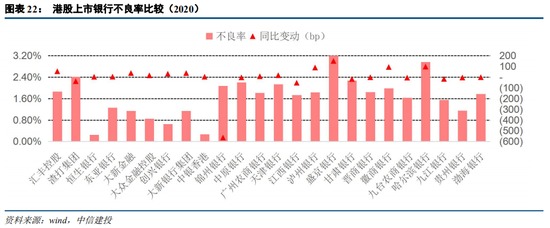 从资本充足率来看,2020年两家港股上市的国际银行的普通股权一级资本比率均有所上升,但一级资本比率及总资本比率来看汇丰控股分别较年初上升130bps、130bps,渣打集团则分别下降30bps、40bps。而上市的香港本土银行中东亚银行及大众金融控股三大资本充足率均有提升,其他银行则资本充足率表现差异化。整体来看,港股上市的国际银行及香港本土银行的资本充足率水平都均处于较高水平。