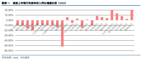 只在港股上市的国内银行大部分2020年利息净收入同比正增长,仅锦州银行、广州农商行、江西银行、盛京银行同比下滑。其中渤海银行、九台农商行及哈尔滨银行利息净收入同比增幅均大于10%,分别增长24.30%、22.40%及13.59%。