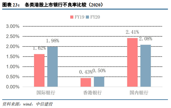 (四)2020年港股上市的银行中国际银行及香港银行的不良率均同比有所上升,而国内银行的不良率同比下降。其中国内银行不良率为2.08%,同比下降33bps,国际银行整体不良率提升36bps至1.98%,香港银行则同比提升7bps至0.50%,保持较低的不良率水平。