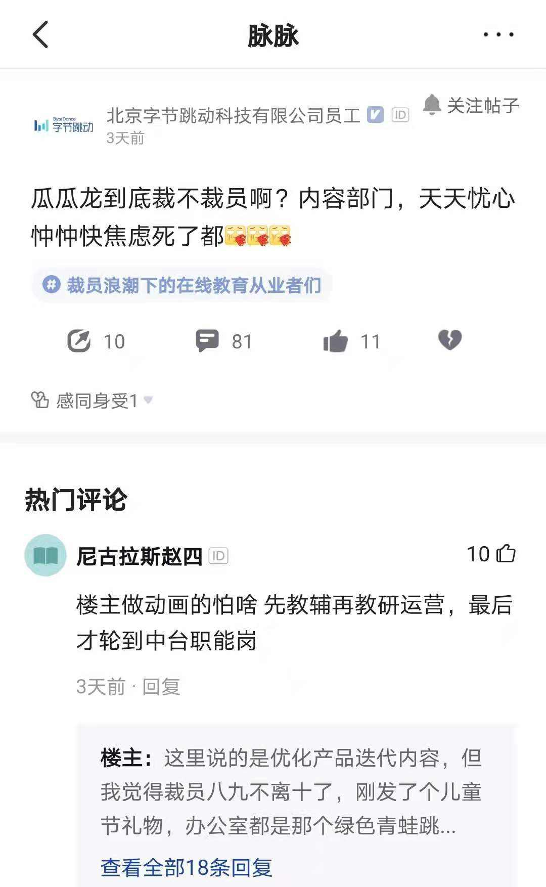 焦虑情绪在蔓延,不管坏消息到没到自己身上,整个行业的从业者都开始坐立不安。很多在线教育企业的员工潜伏在脉脉等平台上,想要打听到行业和自家公司裁员的最新动向,只盼着裁员的屠刀真正落到自己头上时,尽量让自己少一些慌乱。
