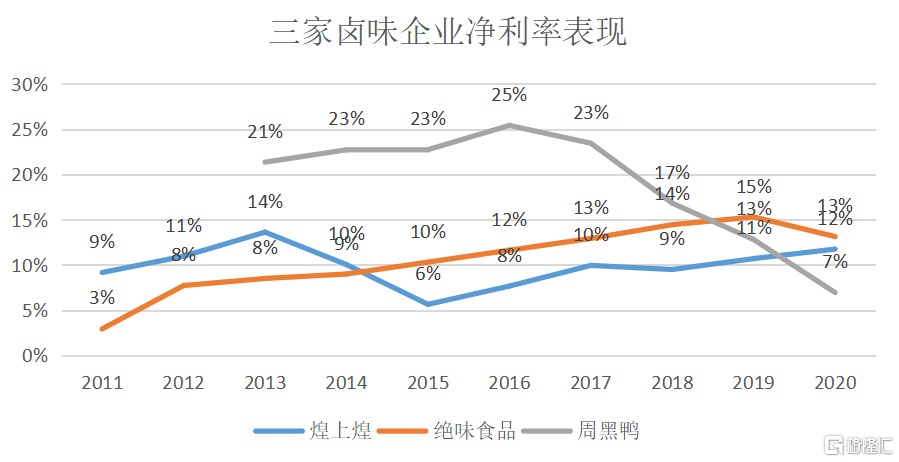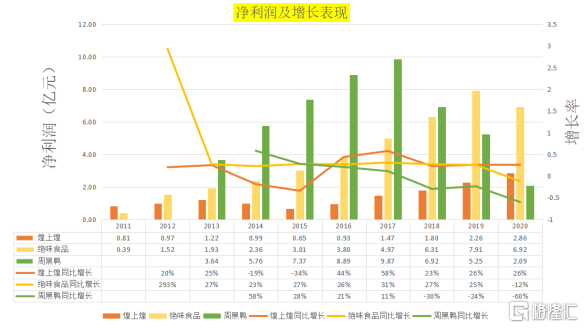 从企业净利润来看(按可比口径),2013-2020年煌上煌、绝味食品和周黑鸭的净利润年复合增长率分别为12.9%、24.2%和-7.6%。