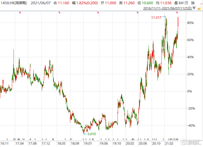 近期周黑鸭受到广泛关注,机构集体扎堆唱好。过去一周股价涨逾13%。若拉长时间线,年初以来周黑鸭涨幅近36%,去年6月以来涨幅逾189%。