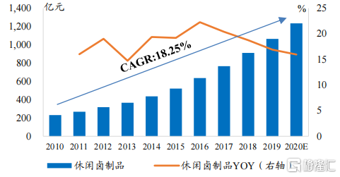 周黑鸭所处行业为食品饮料卤制品,根据Frost&Sullivan统计,2020年中国休闲卤制品市场规模将达到1235亿元左右,2015-2020年年复合增长率为18.8%,保持快速增长。