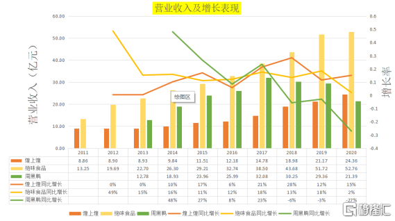 此外,去年疫情期间,煌上煌、绝味食品和周黑鸭收入分别同比增长15%、2%和-27%。三家企业中仅周黑鸭收入规模实现大规模下滑,主要原因是周黑鸭经营大本营在湖北武汉,是去年疫情的重灾区,公司去年上半年受到影响较大。