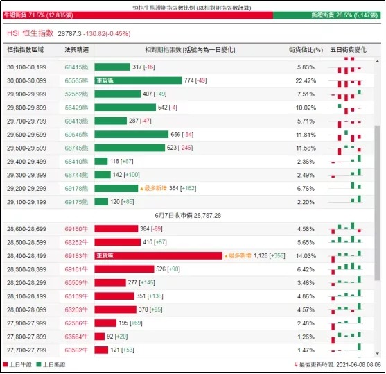 街货分布方面,至周一,恒指牛证街货贴价区间主要在收回价28200点至28700点之间,累计相当约2725张期指合约;恒指熊证街货在收回价29100点至29600点之间,累计相当约1387张期指合约。