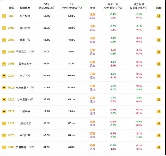 周一恒指相关权证的平均引伸波幅小幅调升,报约18.8%。个股方面,港交所、快手相关认购证的引申波幅调升,港交所、快手、百度相关认沽证的引申波幅调降。