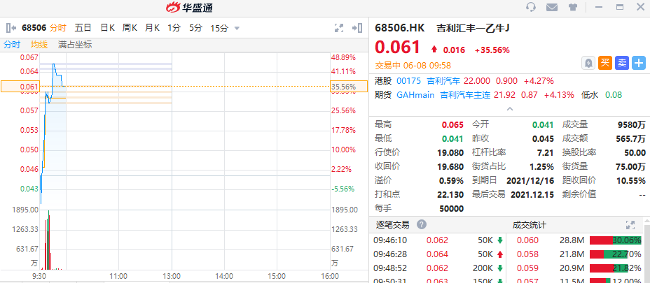 相关涡轮方面,吉利汇丰一乙牛J涨35.56%,其行使价为19.08港元,到期日为2021年12月16日,距收回价10.55%。