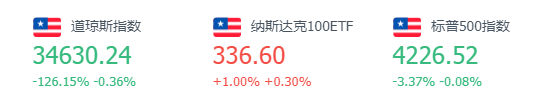 道指跌126.15点,或0.36%,报34630.24点;纳指涨67.23点,或0.49%,报13881.72点;标普500指数跌3.37点,或0.08%,报4226.52点。