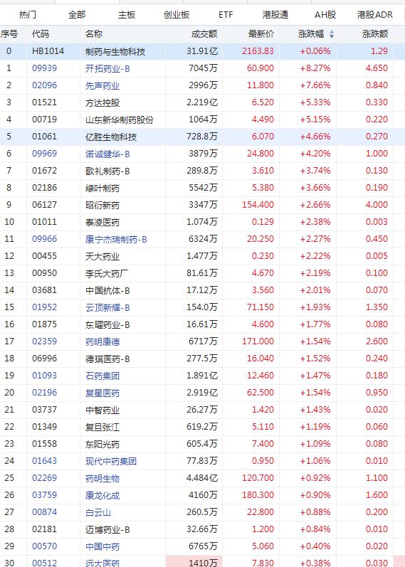 华盛资讯6月8日消息,生物制药板块早盘拉升走高,截止发稿,开拓药业-B涨8%,先声药业涨7%;方达控股、山东新华制药股份涨超5%;亿胜生物科技、诺诚健华-B涨4%;歌礼制药-B、绿叶制药涨超3%。