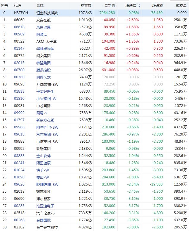 众安在线涨超2%;明源云、华虹半导体、ASM太平洋涨超1%。