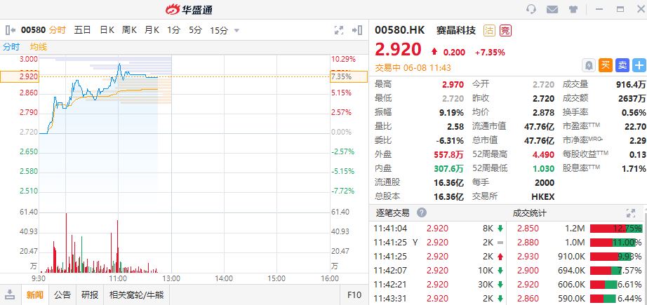 华盛资讯6月8日消息,据浙江融媒体消息,赛晶亚太半导体科技(浙江)有限公司总经理张强表示,预计在今年6月底或者7月初就可以进行试生产,9月份可以实现量产,计划到明年企业可以实现满负荷运作。受消息驱动,赛晶科技走高,截止发稿,赛晶科技上涨7.35%,现报每股2.92港元,总市值47.76亿港元,成交额2637万港元。
