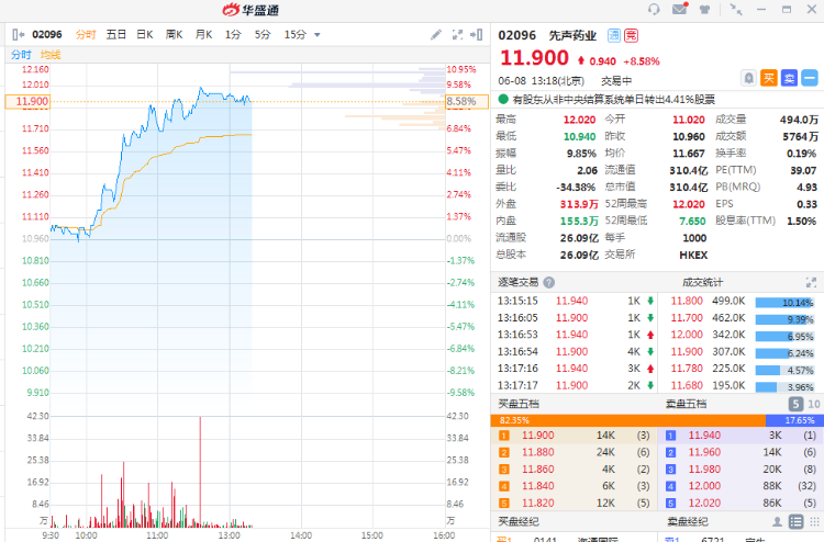 6月8日消息,先声药业涨8.58%,现报11.90港元,最新市值310亿港元。