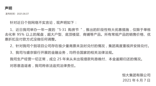 上周,网友纷纷转载恒大以极大折扣销售楼盘等帖子,引发市场对于恒大迫切回笼资金需求的猜想。而财经媒体财新在5月27日发表的文章提到,监管机构可能调查恒大与盛京银行(02066.HK)之间的交易,再度引发市场对于恒大可能涉嫌违规操作等负面猜测。昨日,恒大对此一一做出了以下回应: