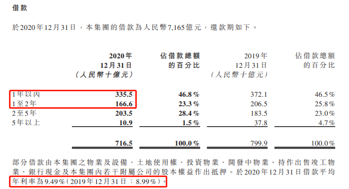 值得注意的是,借款的年利率为9.49%,同比2019年的8.99%有所上升。这意味着恒大每年要偿还的利息就高达680亿元,而2年内需偿还的短期借款也高达5020亿。但年报显示,公司2020年净利润仅314亿元,股东应占溢利更是只有可怜的80.76亿,偿债压力巨大。