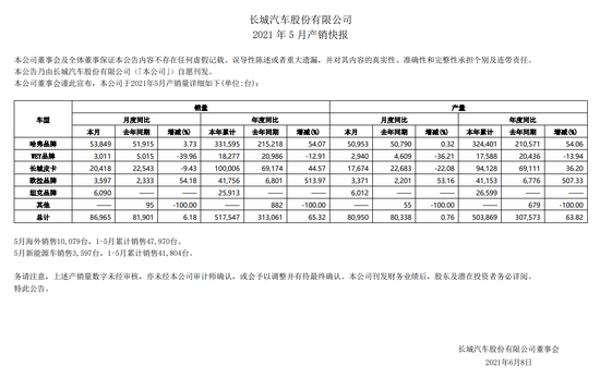 6月8日消息,长城汽车公告,5月汽车销量为86965辆,同比增长6.18%;前5月累计为517547辆,同比增长65.32%。