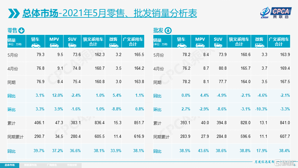 零售:2021年5月乘用车市场零售达到162.3万辆,同比2020年5月增长1.0%,而且相较2019年5月增长3%,前几个月的低基数增量在本月基本消除。