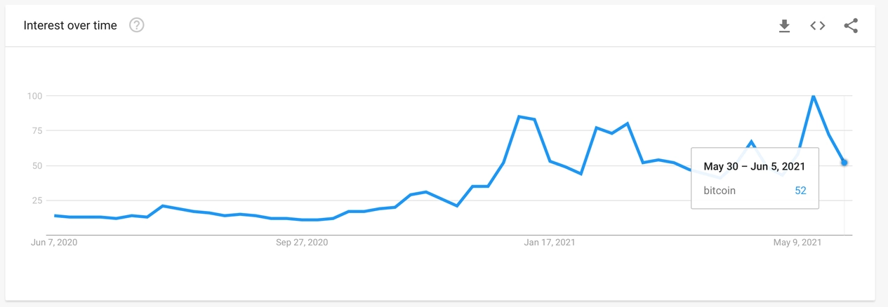5月份谷歌上的搜索查询“比特币”(bitcoin)得分达到历史最高,为100分,但6月5日全球搜索趋势降至52分。BTC、ETH、DOGE、XRP、LTC、BCH等大量数字资产的日交易量均大幅下降。