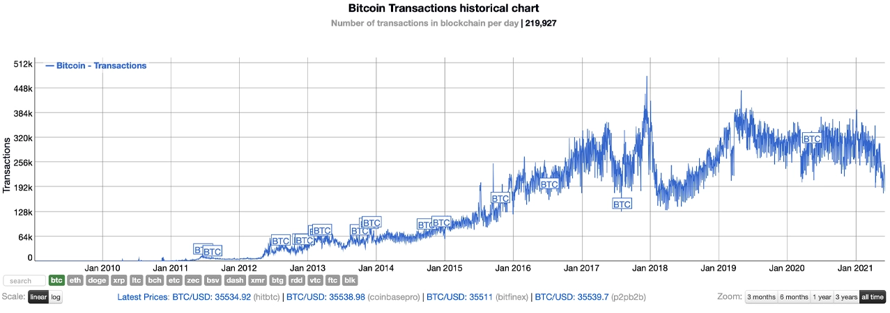 事实上,自2021年第一周以来,比特币的日交易量一直在大幅下降,统计数据显示,1月6日的交易量达到了38.7万笔。Bitinfocharts.com的数据显示,6月3日比特币真实交易数量约为24.9万笔。从1月的第一周到现在,日交易量下降了35%以上。