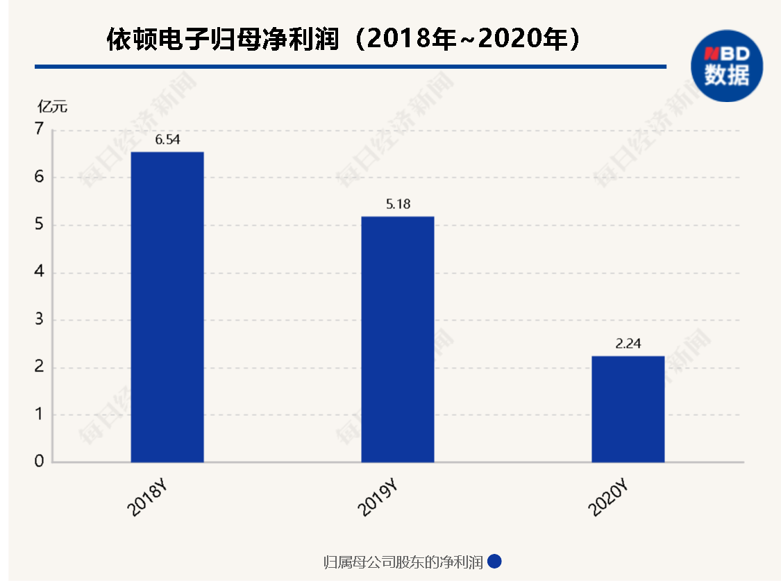 2018年~2020年,依顿电子营业收入分别为33.29亿元、30.11亿元和24.51亿元,归母净利润分别为6.54亿元、5.18亿元和2.24亿元。今年第一季度,依顿电子实现归母净利润3092.88万元,同比下滑64.45%。