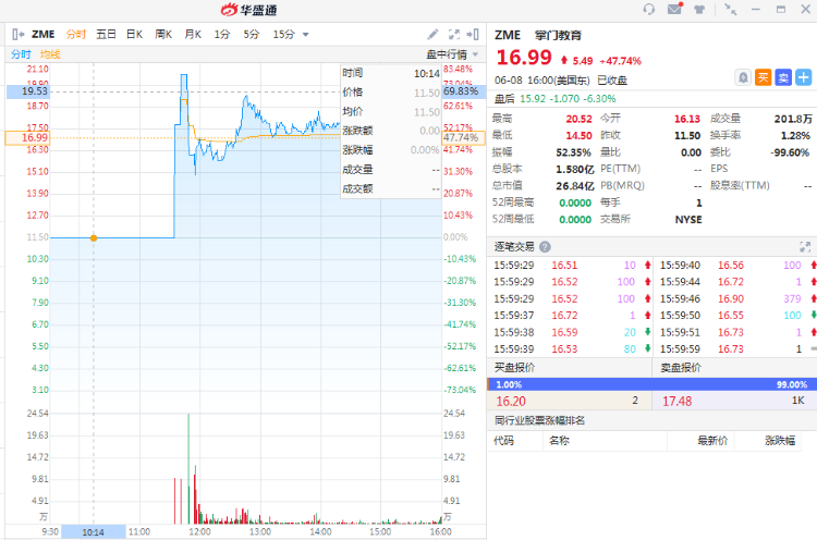 掌门教育周二正式登陆纽交所,上市首日开盘价17.74美元,较发行价11.5美元上涨54.26%,盘中涨幅一度达到78.4%,并触发三次熔断。