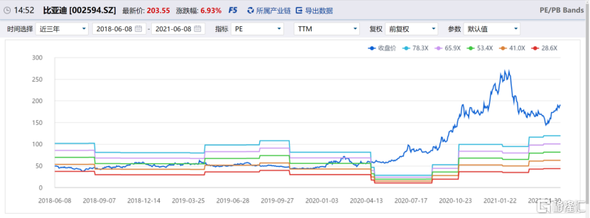 而回看过去一年,比亚迪的PE估值水平经过回调,似乎还是有些偏高。