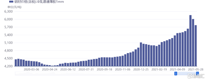 汽车制造行业主要原材料为钢铝铜等金属件、橡胶、塑料、织物等,去年20203Q2至今,这些原材料基本每个季度价格均有上涨。其中,冷轧钢板作为车辆结构件主要原材料,价格自去年一路上涨,到2021年5月已经上涨33%;铜价到今年5月,较2020年低点则是接近翻倍。