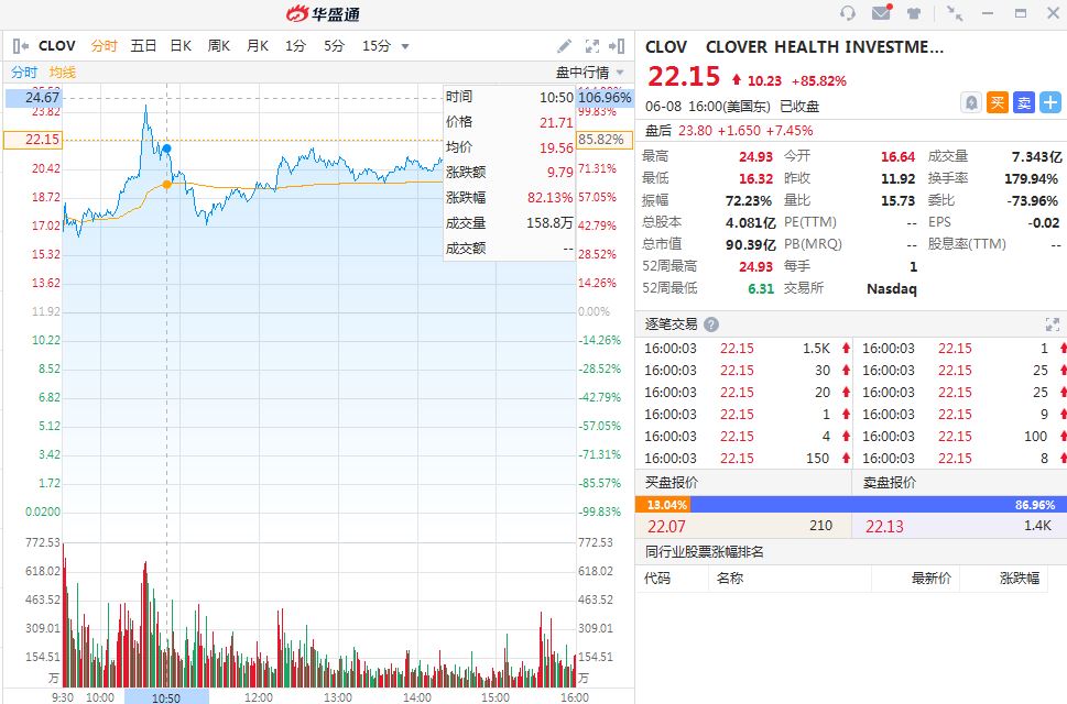 “WSB散户新宠”Clover Health(CLOV.US)一度大涨超100%,讨论量已超黑莓(BB.US)排名第一
