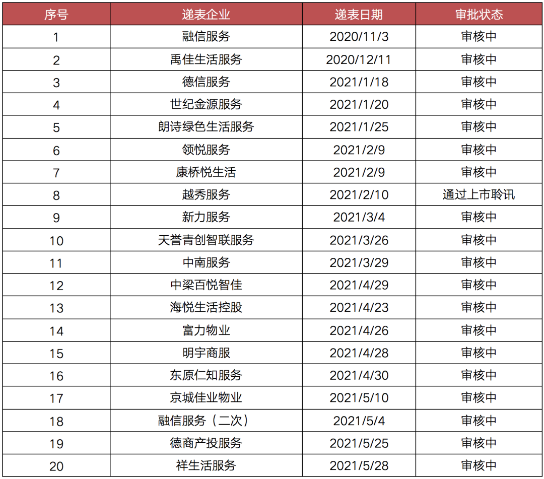 在分拆物业公司上市方面似乎更为顺利,5月多家房企分拆旗下物业公司赴港上市,包括北京城建、德商以及祥生,并且有新希望服务1家物企在5月完成上市。截至5月31日,在港交所递交招股书仍未上市的物业企业共有20家,其中越秀服务已通过上市聆讯,融信服务则两次递表。