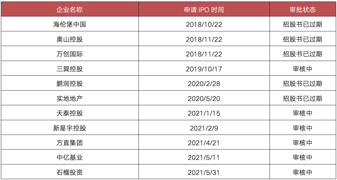截至2021年5月31日,在港交所递交招股书但仍未上市的房企共有11家,其中2021年以来共有5家房企房企递交招股书。值得注意的是,2021年之前递交上市申请的企业中仅有三巽控股更新过招股书,其余企业均显示“招股书已过期”。