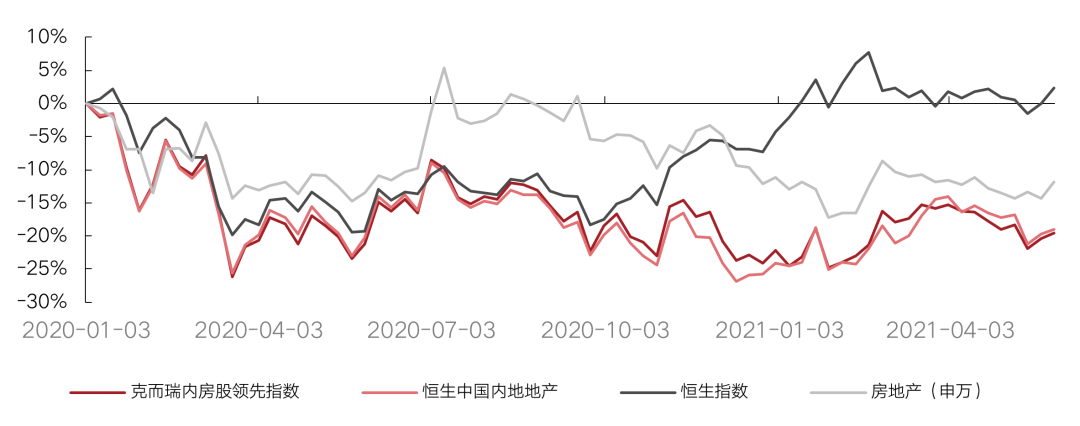 整体来看,自2020年1月1日至今,克而瑞内房股领先指数跌幅19.5%,同期恒生中国内地地产指数跌幅19.0%。恒生指数涨幅2.4%,房地产(申万)板块跌幅11.8%。2021年5月,恒生指数上升1.5%,克而瑞内房股领先指数下降0.9%,恒生中国内地地产指数下降2.2%,房地产(申万)板块上升1.8%。