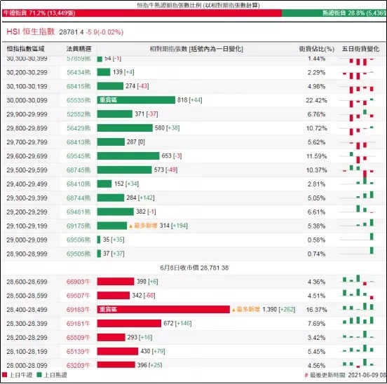 街货分布方面,至周二,恒指牛证街货重货区仍在收回价28300点至28700点之间,累计相当约2794张期指合约;恒指熊证街货重货区在收回价29600点至30100点之间,累计相当约2709张期指合约。