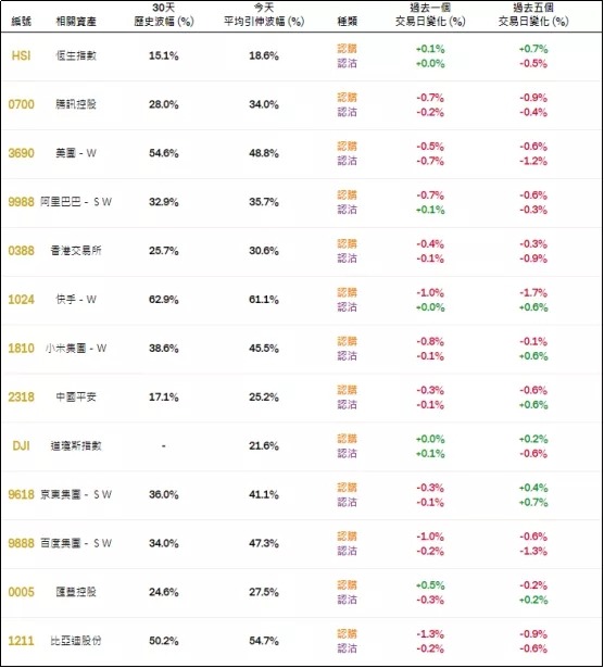 周二恒指相关权证的平均引伸波幅约18.6%,按日略有下调。个股方面,腾讯、阿里、快手、百度、比迪等相关认购证的引申波幅按日调降显著;而汇丰相关认购证的引申波幅则按日有所调升。