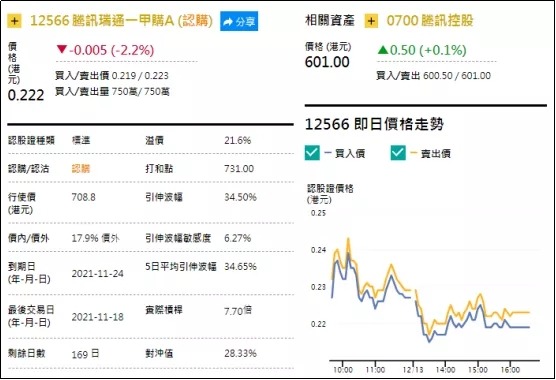 2、看错方向:腾讯瑞通一甲购(12566.HK),周二下跌2.2%。