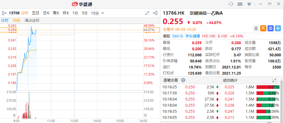 相关涡轮方面,京健瑞信一乙购A涨44.07%,其行使价为112.88港元,到期日为2021年12月1日,溢价19.76%。