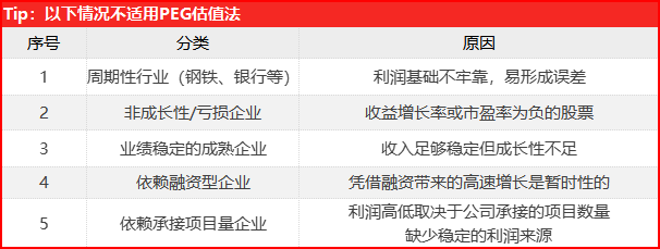 市场普遍认为,在一般情况下,PEG小于1,这只股票处于被低估的状态,PEG=1时,处于估值的合理区间,然而当PEG大于1时,这只股票则处于高估的位置。