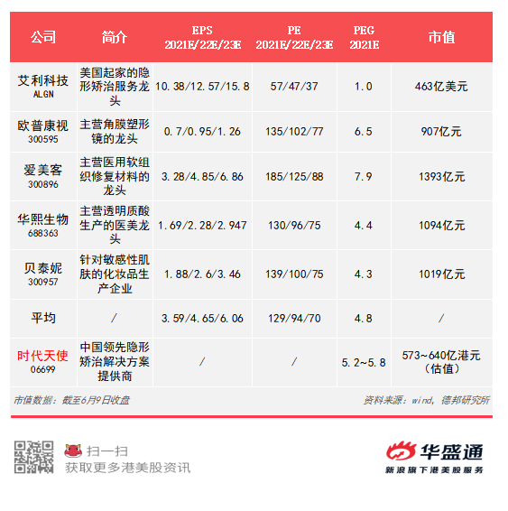 例如德邦证券采用PEG 估值法,选取以下五家公司作为时代天使的可比公司进行相对估值。该机构预计公司20210-2023年净利润分别为2.2亿元、3.1亿元、4.2亿元,同比增长48.6%,38.6%,34.3%。给予公司 2021 年5.2-5.8 倍PEG,对应市值470~524 亿人民币,即约为573~640亿港币。