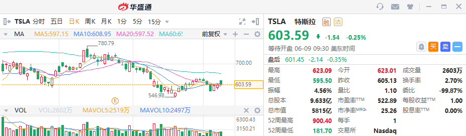 然而,销量数据亮眼的特斯拉却没有得到投资者的追捧。6月8日,特斯拉股价高开后一直走低,截至收盘。收跌0.25%,盘后报601.45美元。