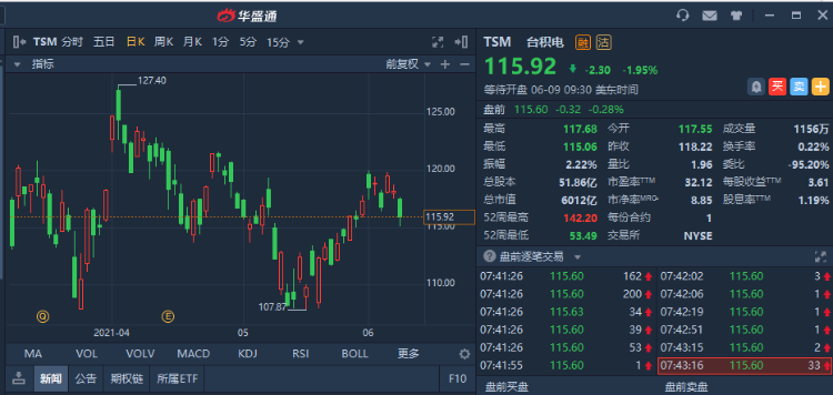 截至发稿,台积电盘前跌0.28%,报115.60美元。