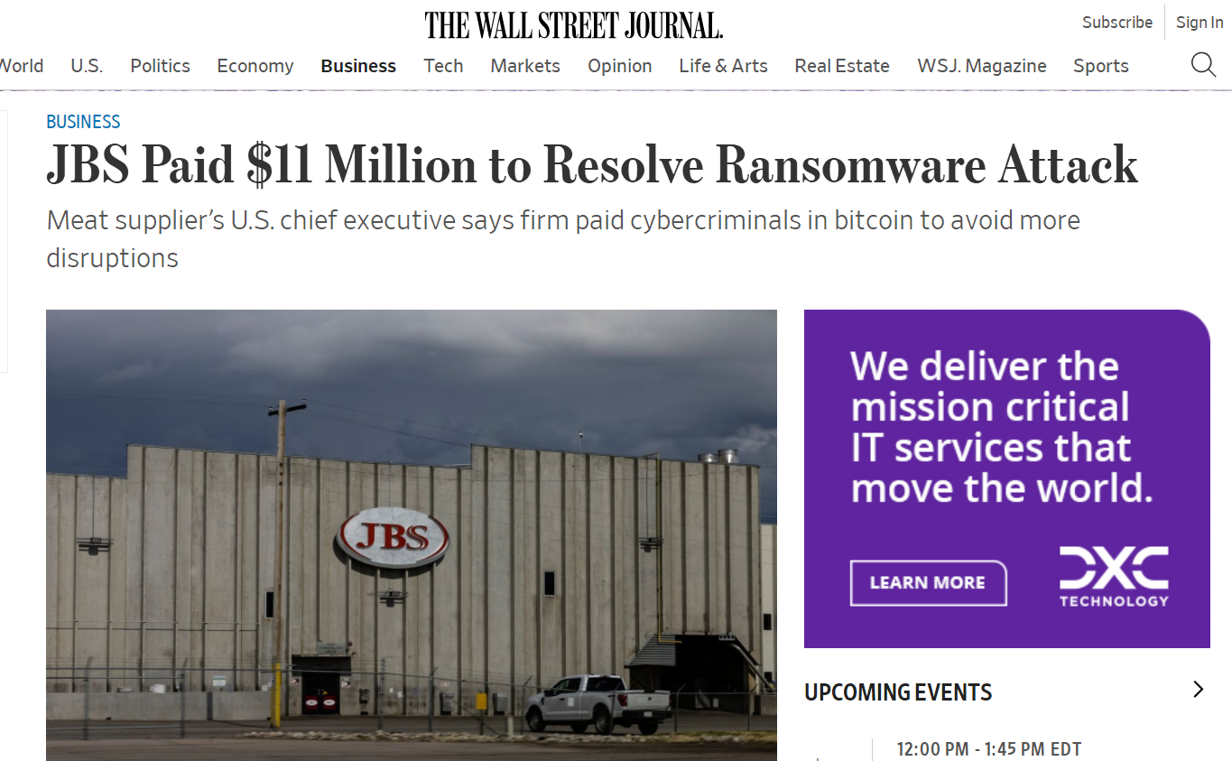 【环球网报道】据《华尔街日报》9日报道,世界肉类加工企业巨头JBS股份有限公司美国分部的首席执行官表示,该公司向网络犯罪分子支付了1100万美元的赎金。JBS美国分部此前曾发表声明称,该公司在当地时间5月30日遭到了“有组织的网络攻击”,受影响的系统包括美国分部和澳大利亚分部。