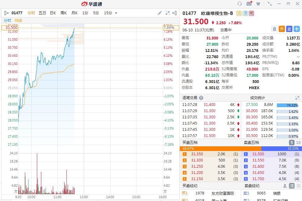 华盛资讯6月10日消息,欧康维视生物转涨,截止发稿,每股报31.5港元,总市值198亿港元,成交额3.26亿港元,换手率1.84%。该股早间受配股消息影响,一度跌超4%。