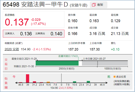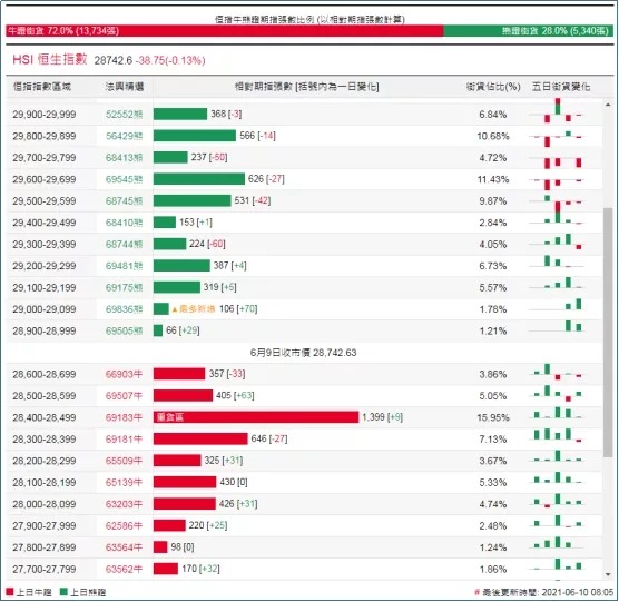街货分布方面,至周三,恒指牛证街货贴价区间主要在收回价28200点至28700点之间,累计相当约3132张期指合约;恒指熊证街货在收回价28900点至29400点之间,累计相当约1102张期指合约。