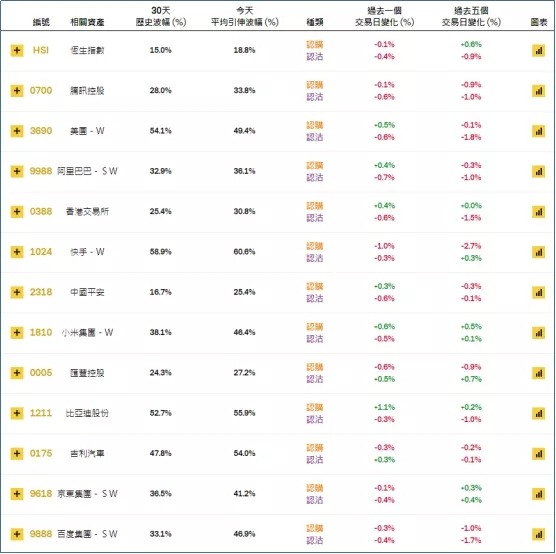 周三恒指相关权证的平均引伸波幅报约18.8%。个股方面,快手相关认购证的引申波幅调降,比亚迪相关认购证的引申波幅调升。